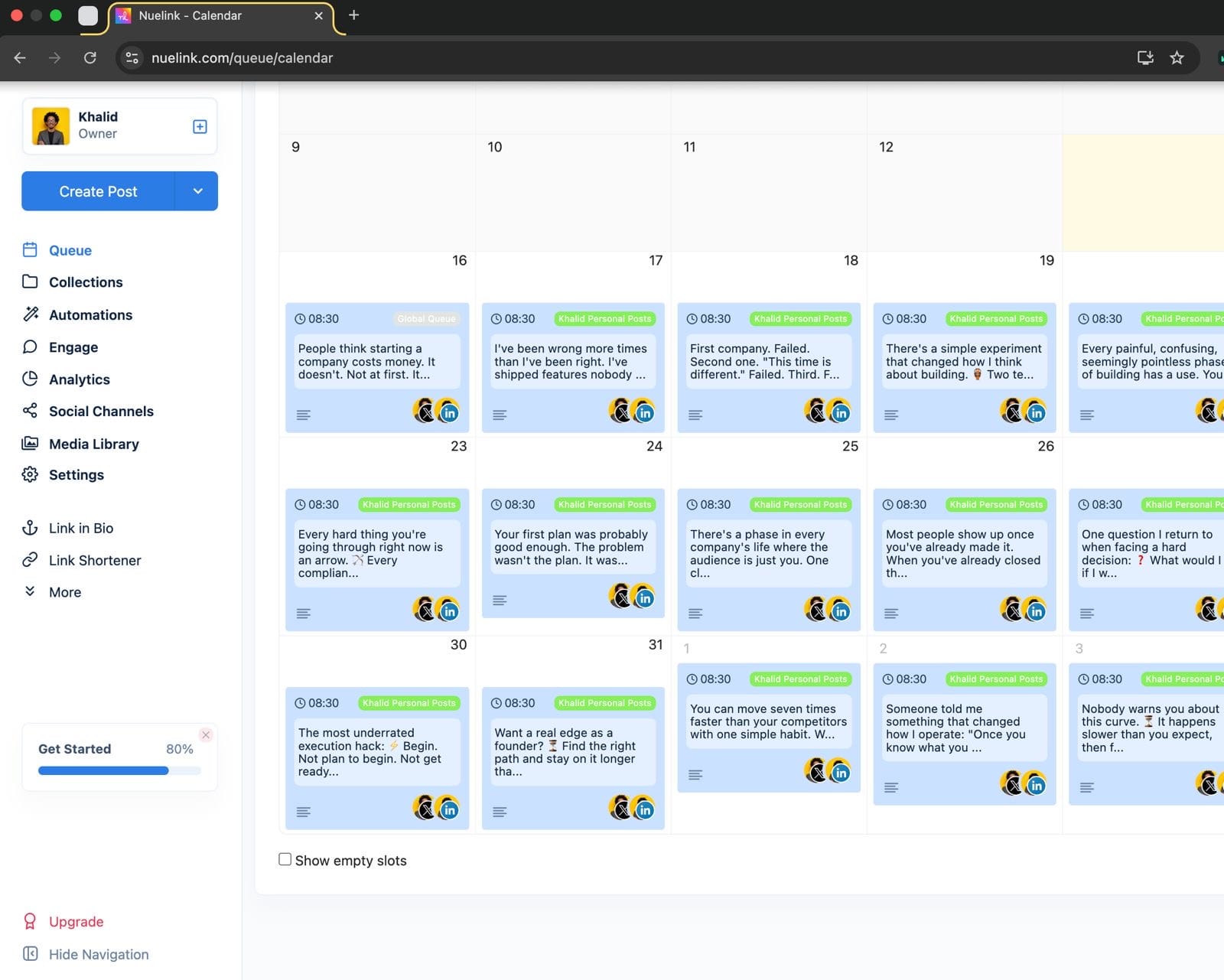 When Cowork is generating and scheduling content at scale, you need a queue that doesn't break under the load. Nuelink's queue is built for volume. Cowork can keep adding posts without ever overwriting or disrupting what's already scheduled.