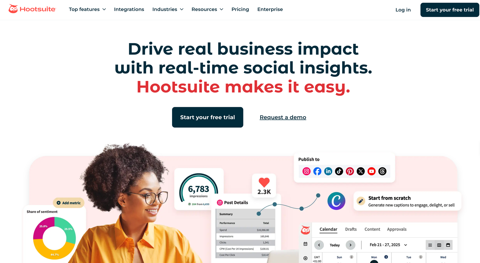 Its scheduling system is strong. Users can plan posts across multiple networks, preview content, save drafts, and bulk-schedule content. Hootsuite also offers social listening tools that help teams track keyword trends, brand mentions, and competitor activity.