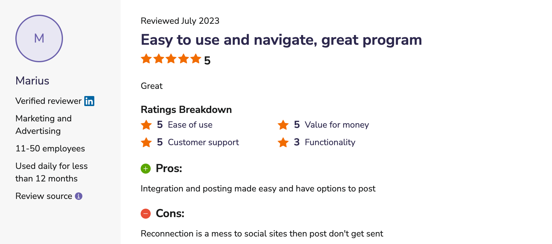 Software Advice highlights two main strengths of SocialBu. Great value for money, meaning it’s affordable without sacrificing functionality, and its ease of use.