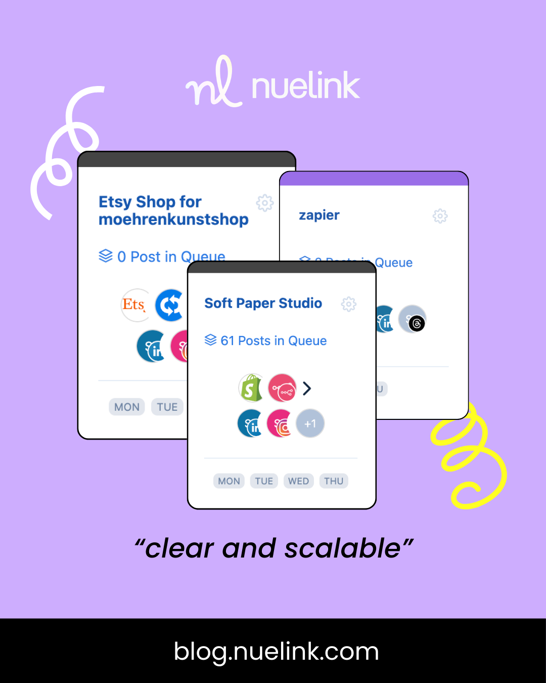 - Save time by letting Nuelink decide where and when posts go