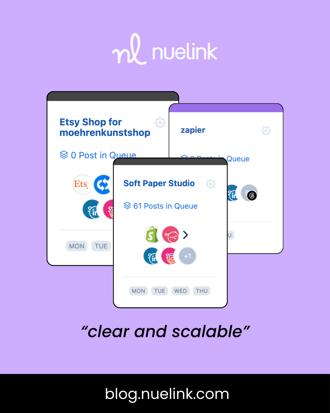 Once clips are ready, Dustin uses Nuelink’s bulk scheduling to distribute content across multiple platforms and channels simultaneously. Instead of scheduling each post manually, he uploads and organizes large batches of content within a single workflow.