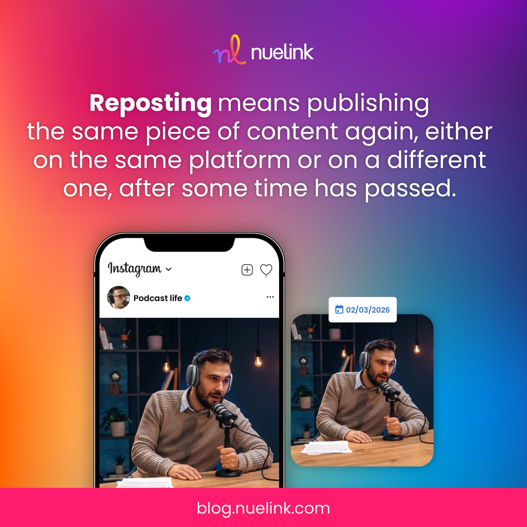 Reposting means publishing the same piece of content again, either on the same platform or on a different one, after some time has passed.