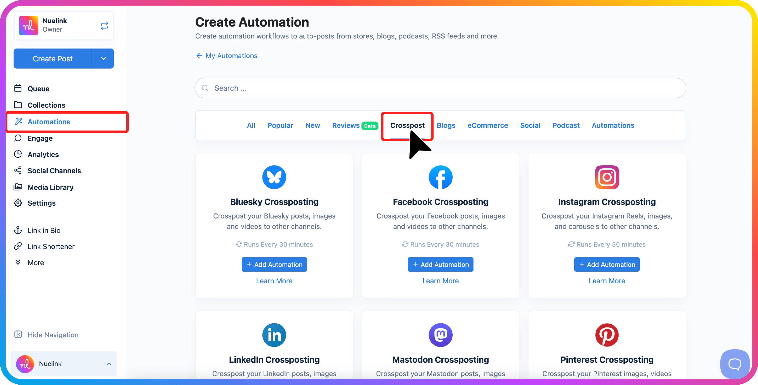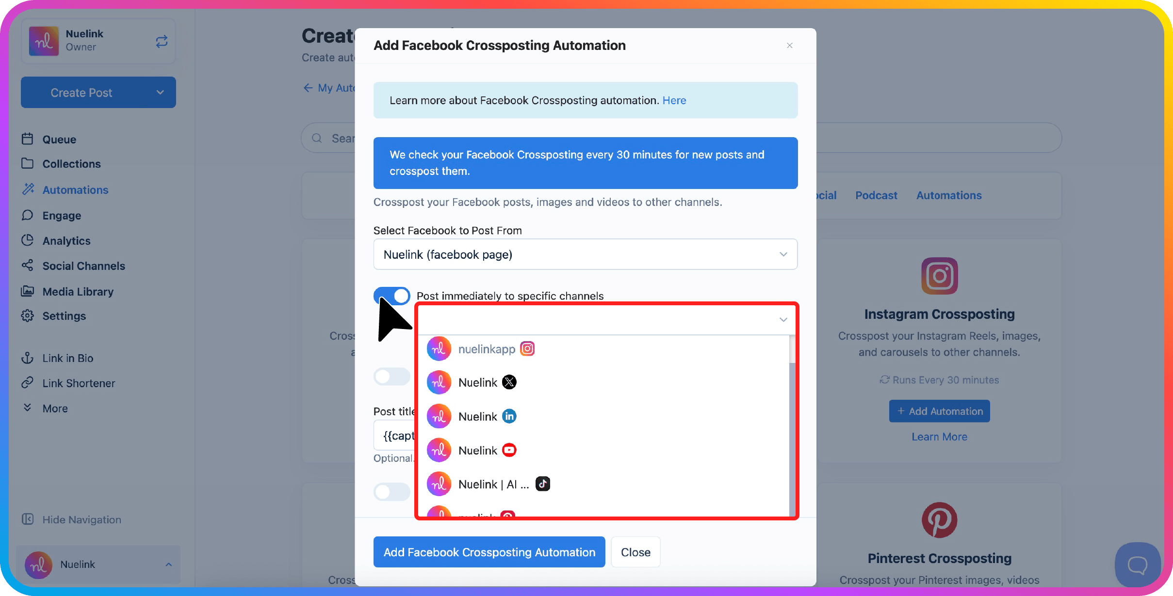 This is where Nuelink comes in. Their Facebook crossposting automation allows you to schedule one post and push it across multiple platforms seamlessly. You maintain consistency, save time, and reduce mistakes.