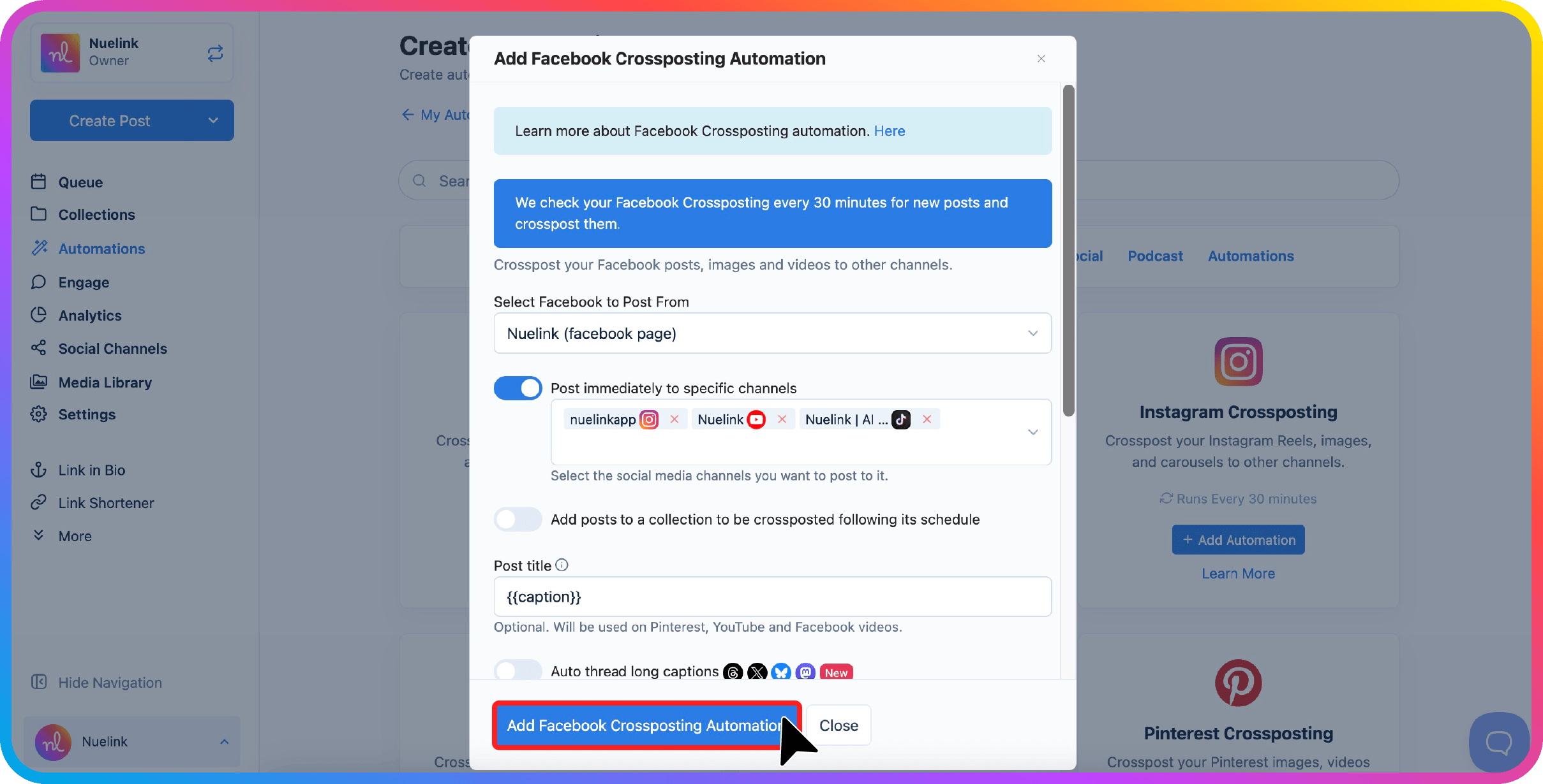 Once everything looks good, click Add Facebook Crossposting Automation.