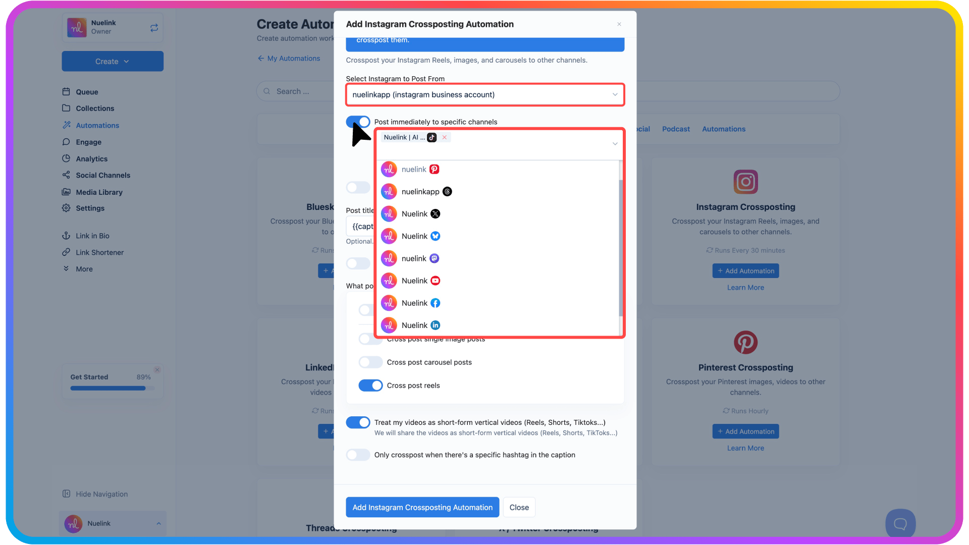 And while TikTok is a powerful channel, it’s only one piece of your distribution strategy. Nuelink also lets you automatically crosspost your content across multiple platforms, so you can grow everywhere without extra effort.