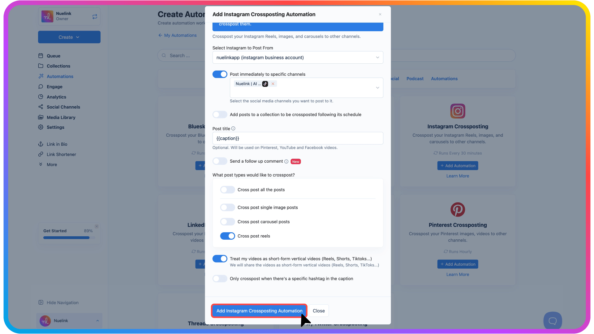 If Instagram is already part of your workflow, there’s no need to manually repost everything on TikTok. You can automate the process and publish your content across both platforms in one step using Nuelink.