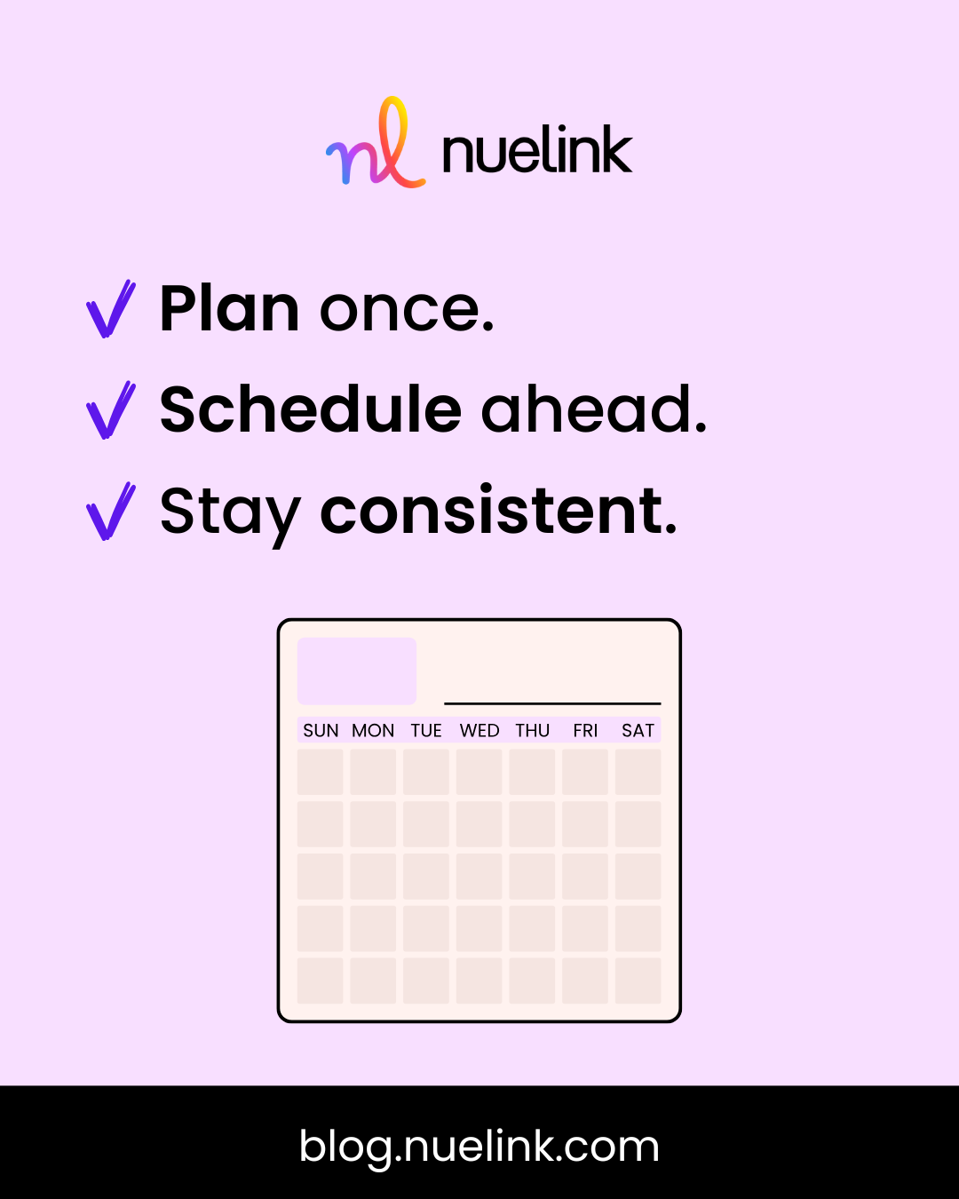 By the end of the Nuelink Consistency Challenge, we want participants to walk away with a realistic posting routine they can actually maintain. The goal is to feel more confident in the content process, experience less stress around planning and publishing, and see visible progress across social channels.