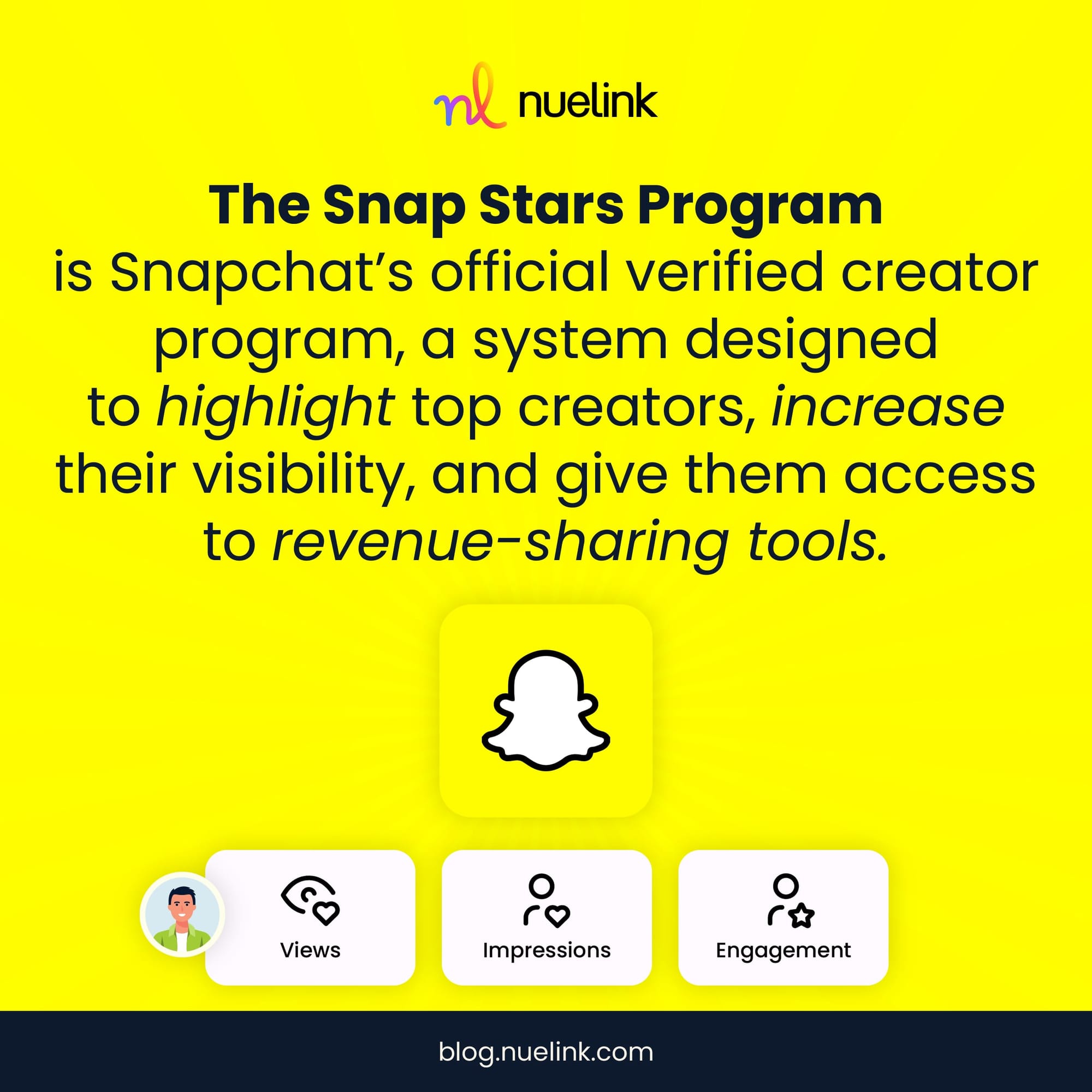 The Snap Stars Program is Snapchat’s official verified creator program, a system designed to highlight top creators, increase their visibility, and give them access to revenue-sharing tools.