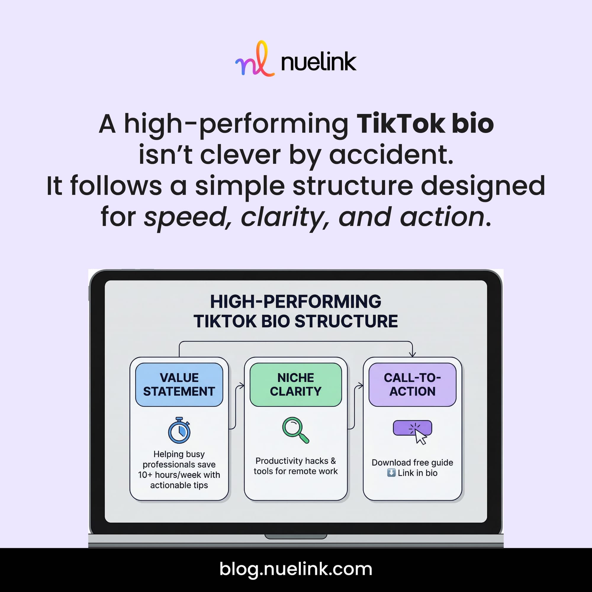 A high-performing TikTok bio isn’t clever by accident. It follows a simple structure designed for speed, clarity, and action, all within TikTok’s tight 160-character limit.
